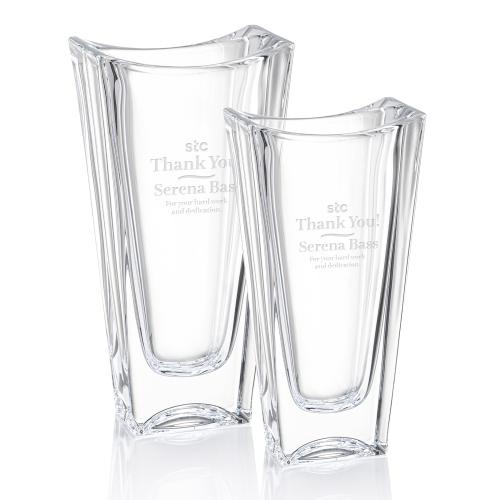 You and your recipient will love our Rectangular Top Crystal Vase - Deep Etch Ready. Elevate your home decor with the exquisite elegance of Kusak Crystal's Rectangular Top Crystal Vase. This contemporary crystalline masterpiece showcases a gracefully bowed rectangular top that leads to a refined oval opening, perfectly blending modern design with timeless sophistication. Expertly crafted from premium crystal, this vase is ready for deep etch personalization, making it an outstanding choice for those seeking to add a touch of bespoke charm to their space or present a luxurious, memorable gift. Whether displayed alone or paired with its matching bowl, this vase is a true testament to refined taste and sophistication. (Note: The image shows an example of personalization; all items are delivered blank and ready for custom etching.)