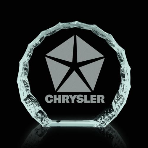 You and your recipient will love our Sure! Here's a product title: Jade Glass Round Iceberg Paperweight - 4. The Jade Glass Round Iceberg Paperweight is a stunning addition to any desk, offering a blend of elegance and practicality. Crafted from .75" jade glass, this 4-inch freestanding piece features hand-chipped and polished edges, creating a dynamic, icy look. Ideal for simple, bold designs, its limited etching area ensures your chosen design stands out with clarity and impact. While the glass begins blank, it provides a perfect canvas for personalized engraving. Also available in starfire glass, this paperweight not only keeps your documents in place but also serves as a tasteful decorative item that speaks volumes about your style and sophistication.