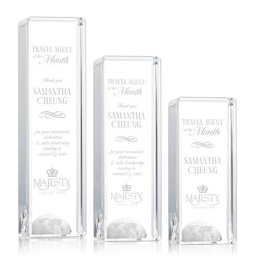 You and your recipient will love our Crystal Globe Tower Award - Elegant Recognition. Introducing the Crystal Globe Tower Award â a striking tribute designed for celebrating momentous achievements. This freestanding masterpiece features a meticulously crafted globe at its base, symbolizing global success and vision. Made from premium optical crystal, its clarity and brilliance capture the light beautifully, making it a centerpiece of recognition. Whether honoring outstanding leadership or international accomplishments, this award pairs elegance with significance. Each award is ready for personalized engraving and is presented in a luxurious satin-lined gift box, underscoring its prestige and thoughtfulness as a corporate gift. Ideal for expressing appreciation with a touch of sophistication.